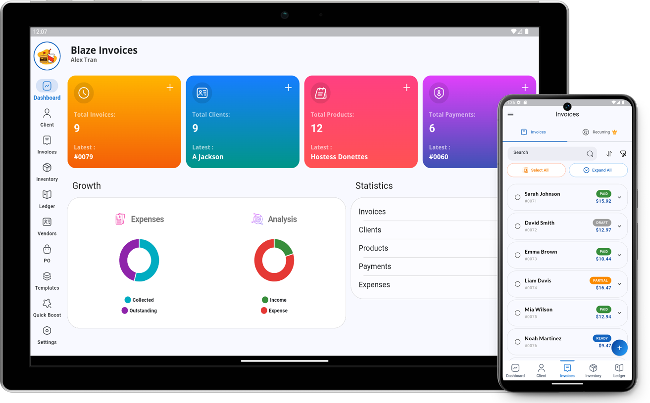 Blaze Invoices works flawlessly across all platforms—desktop, tablet, and mobile—giving you control wherever you go. Designed to help you manage every aspect of your business, Blaze Invoices delivers a streamlined experience.